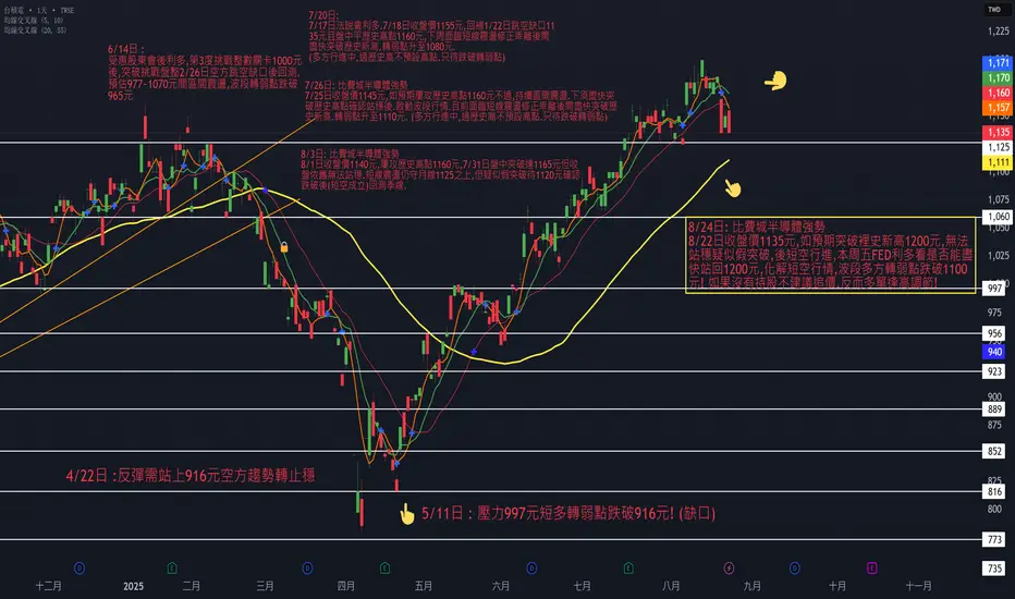🔹 關鍵觀察:本週五(8/30)美國聯準會(Fed)利多消息若能激勵台積電重新站回 1200 元關卡,有機會化解短空結構,重新轉強。