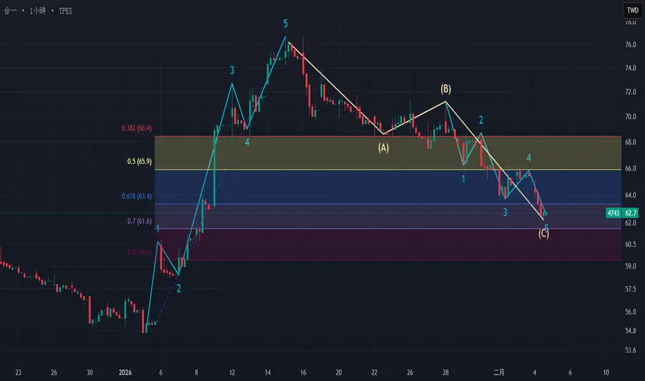 目前也是五段往下推結構尚屬完整,同時也來到回測0.618~0.7區間。