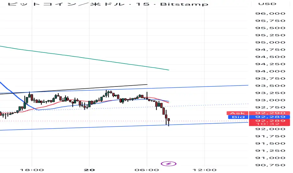 ということで、本日はブルーの切り上げチャネルを作っており、継続してショート狙いとなりそうです。このチャネルを下抜けたらショートエントリー。