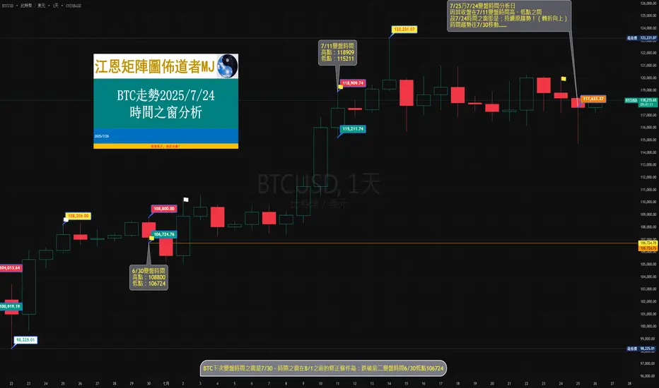 7/25是7/24變盤時間分析日,以7/11變盤時間高點118909、低點115211為研判轉折標準;