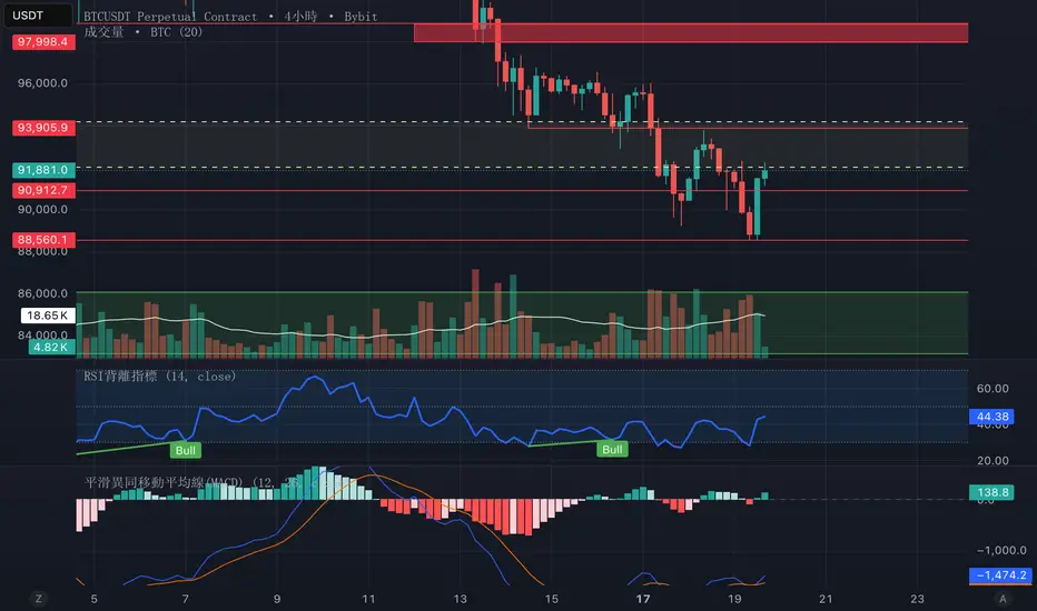 昨天BTC在前底93900附近受阻下跌,補足了四月的缺口,亦反彈留下吞沒陽線。