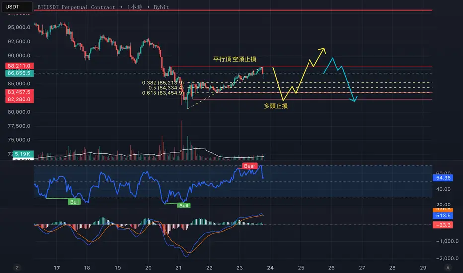 價格先到下方底點打倒多頭流動性,同時測試前方吞沒陽線守住時可做多,目標到88210