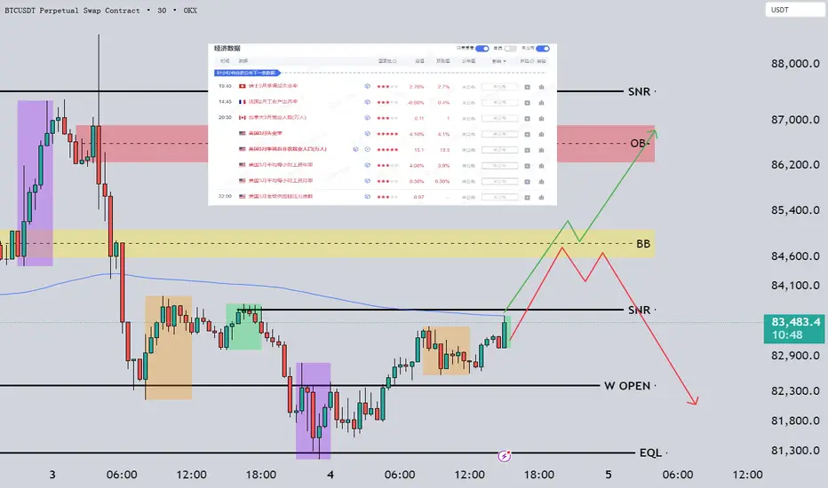 若數據偏空,可能打壓反彈行情;若利多釋放,價格有機會突破 BB 區,測試上方 OB- 壓力區。