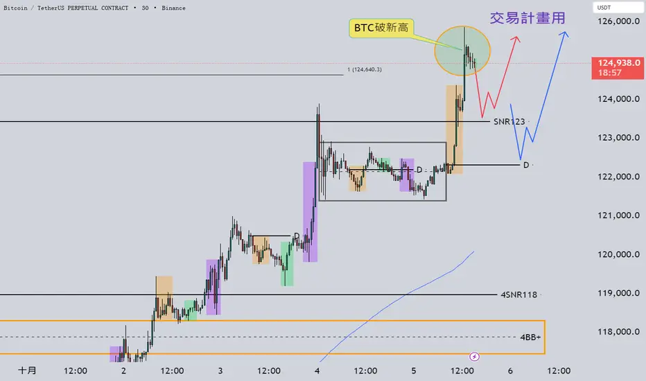 整體仍維持多方主導格局,若價格守穩 SNR123($123,400),有機會再次啟動上攻挑戰目標區