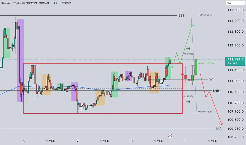 BTC 目前仍在 $111,000 上下震盪,結構卡在週開盤與區間壓力之間