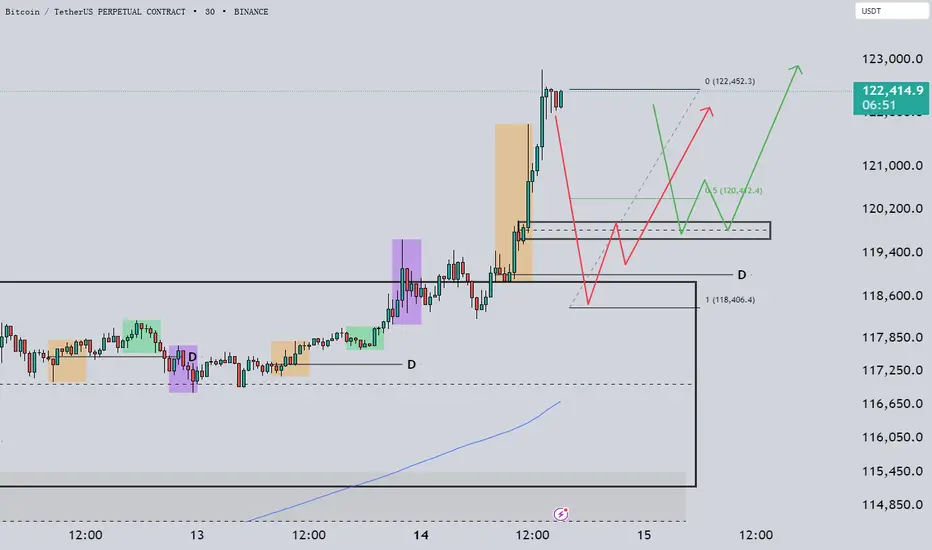 BTC 突破 $122,000 後,目前高檔橫盤整理,暫時受限於 $122,450 壓力區