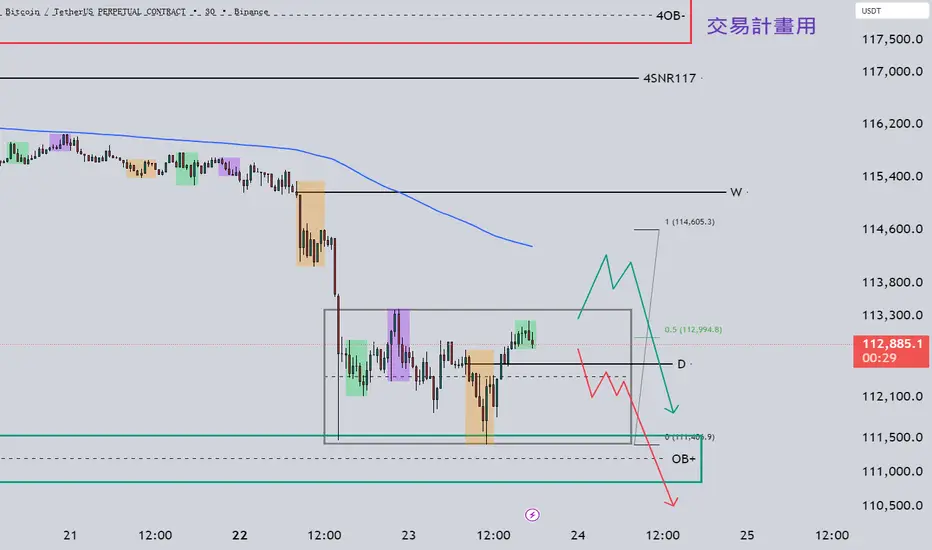 BTC 目前在 $112,900 一帶震盪整理,下方 OB+ 仍是關鍵支撐