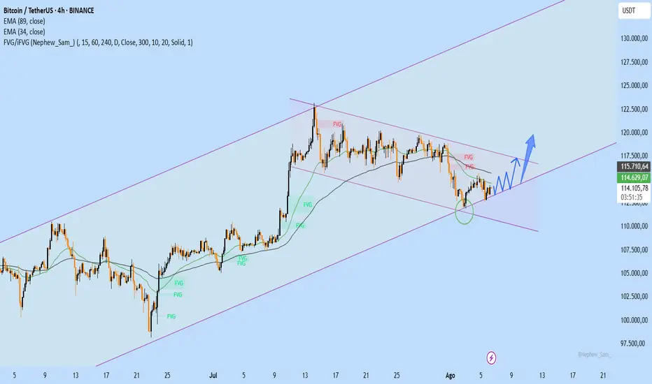 El gráfico muestra que BTC aún se mantiene dentro de un canal alcista de mediano plazo, con un rebote en la parte inferior del canal en la zona de los 113.400 USDT, lo cual forma un patrón potencial de reversión. La vela alcista en ese punto, junto con la aparición de una nueva zona FVG, indica que la presión compradora está regresando.