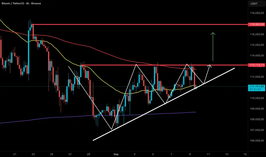 Bitcoin konnte den Widerstand an der roten Linie bei 113.114 USD sowie die 200er EMA auf dem 4h-Chart nicht überwinden und wurde erneut abverkauft. Der Kurs findet jedoch vorerst Support an der weißen Trendlinie.