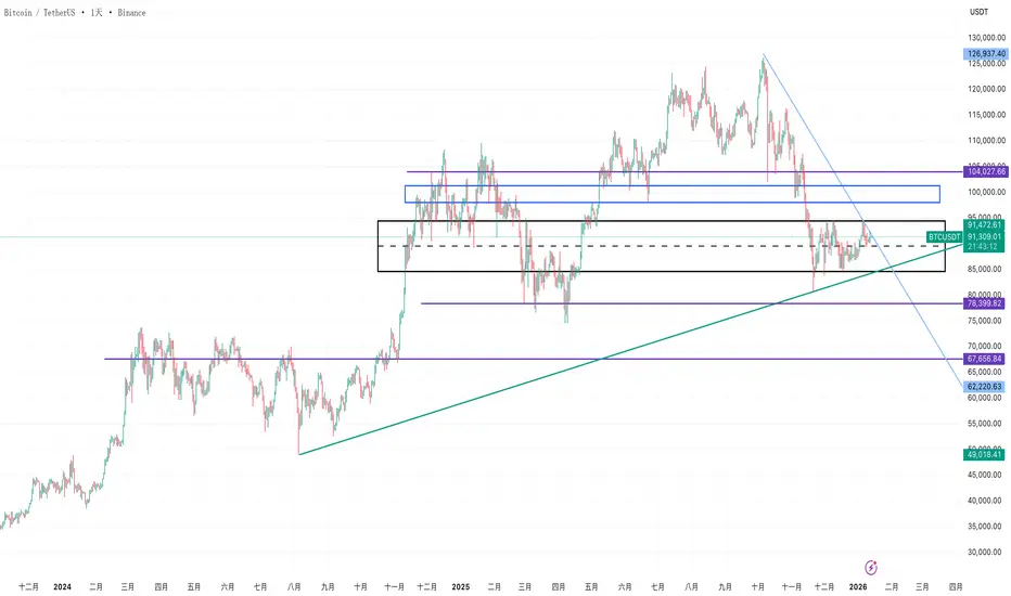 市場目前處於「蓄勢」而非「轉勢」。在綠色趨勢線失守前,保持多頭思維,耐心等待價格從中軸區 (91k) 走向邊界,那裡才有肉吃。