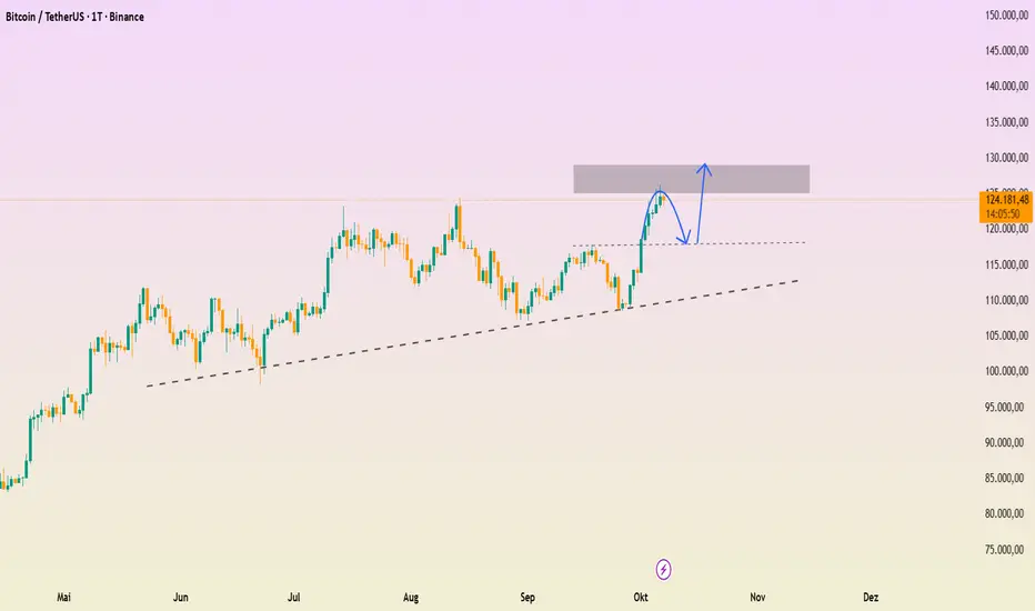 Laut dem BTCUSDT-Chart handelt der Preis derzeit in einem klaren Aufwärtstrendkanal, mit einer Unterstützung bei 118.000 USD. Sollte Bitcoin leicht auf diesen Bereich zurücksetzen, wäre dies eine gute Gelegenheit, den Aufwärtstrend fortzusetzen. Das nächste Ziel für BTCUSDT ist der Widerstand bei 128.900 USD.