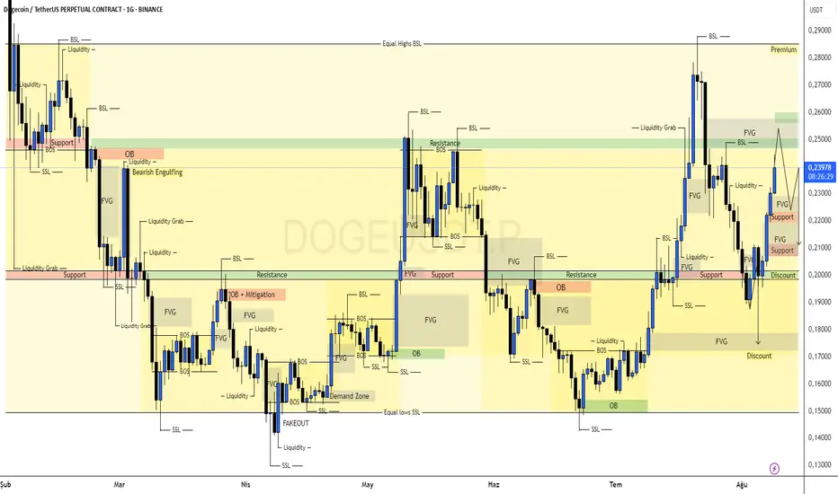 "DOGE, 0.20$ üzerinde kapanışlarla birlikte pozitif görünüme geçti ve yükselişin devamı geldi. Haftaiçinde güçlü bir performans sergilediğini düşünüyorum. Ancak, yeşil taralı bölge (0.25–0.26$) aşılmadığı sürece yapının negatife dönme olasılığını yüksek görüyorum. Oklarla işaretlediğim senaryonun gerçekleşme ihtimali güçlü, kırmızı taralı alanlar radarımda."