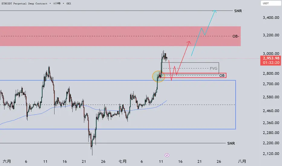 ETH 目前處於 OB 支撐區與 FVG 區間回踩階段,短線觀察吸籌效果