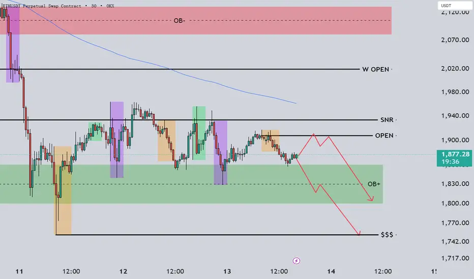 👉 這是短線壓力,若價格無法有效突破,則可能回測 OPEN($1,900) 或 OB+($1,820 - $1,860)。