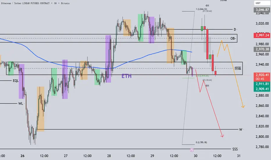 價格在測試上方 D開 (3009) 阻力後放量下跌,目前已貫穿 OB- 區域 並來到 拐區 邊緣