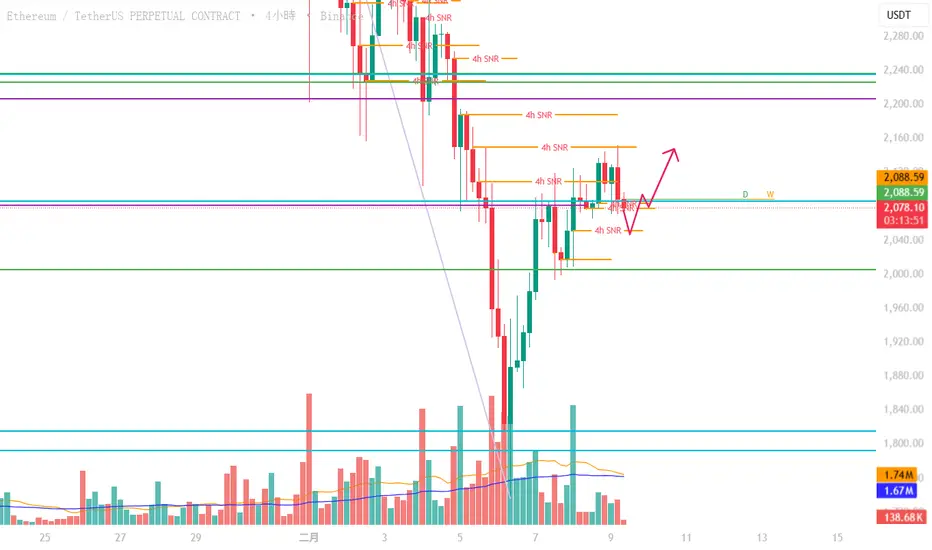 價格回到 4H SNR 密集區(約 2070~2090),屬於關鍵多空轉折帶