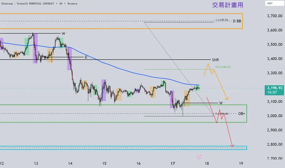 整體仍在 200EMA、SNR、W 區 之下,多頭尚未奪回控制權,行情偏空不變
