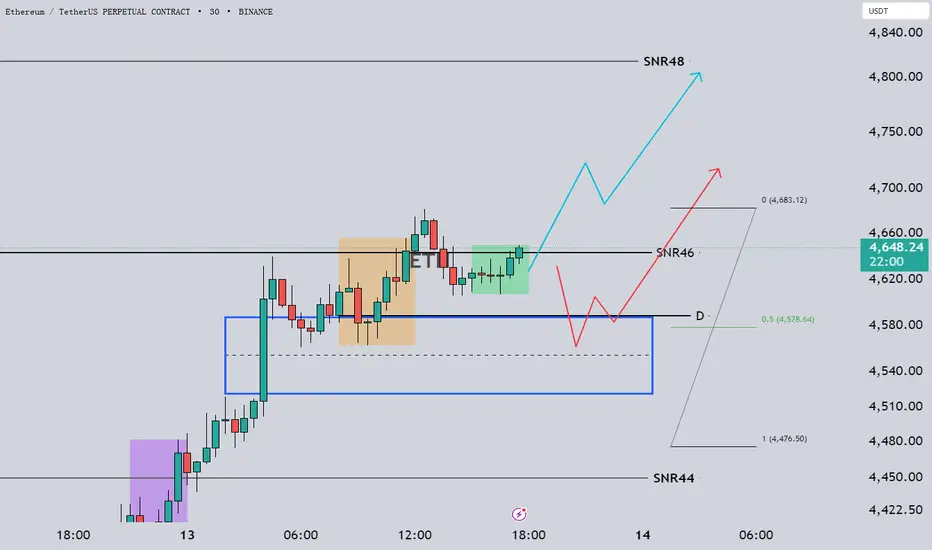 ETH 當前價格在 $4,636 一帶震盪,短線結構介於 SNR46 壓力與 D 區支撐之間