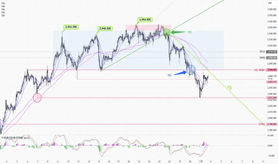 1小時圖(上圖) > 升勢自從二月初第一次測試高位2942之後進入橫行狀態,兩週前已開始建議部署在高位沽空。1小時圖在上週四失守2880(2)後,趨勢以往下跌主導,參考下降趨勢線(3),留意下降趨勢會否加快。短線走勢只要價格停留在關鍵阻力2880(4)之下,下降趨勢將會繼續。而本週仍須留意地緣及關稅局勢發展,特發消息會是技術走勢失效的重要因素。