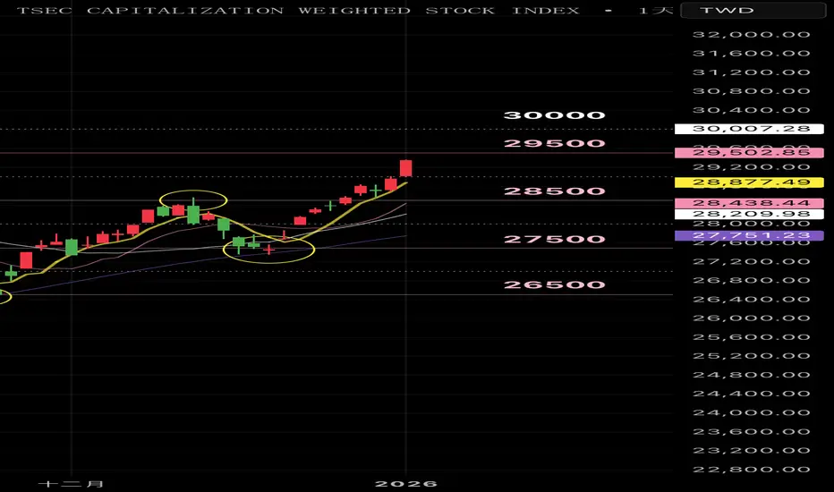 從2025 10月份來看,加權在500點間格的區間容易產生支撐與壓力,指數要往30000點邁進前,要注意29500點能不能順利突破!