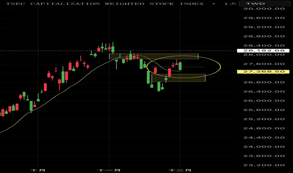 加權週一遇前波空方缺口壓力收盤下跌283點收27342點跌破前高支撐守月線!昨收實體黑k加上美指收黑,今續往下探機率高!主要觀察月線支撐是否有效!若跌破月線又跌破下方缺口的話,指數將回測前低支撐26395!