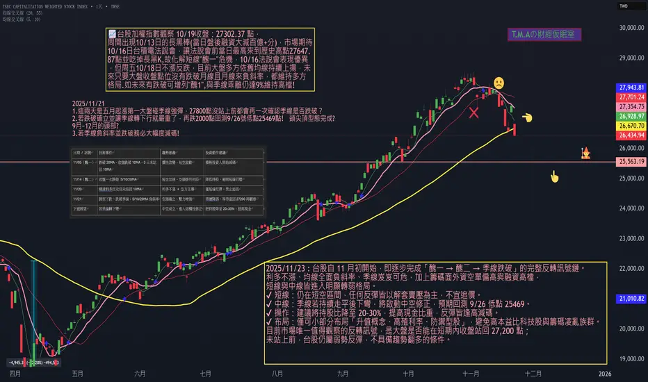 4. 11/21日 跳空下跌(收盤 26434.94點)5MA、10MA、20MA 全負斜率,季線首次被跌破;短線未站回 27200(5MA)=維持短空。