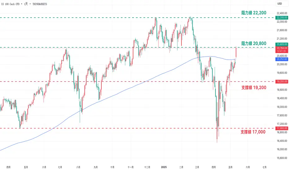 隨著貿易戰的持續降溫,NAS100自 4 月初低點以來已強勁反彈超過 25%,並成功站上關鍵的 200 日均線,正式重返技術性牛市。