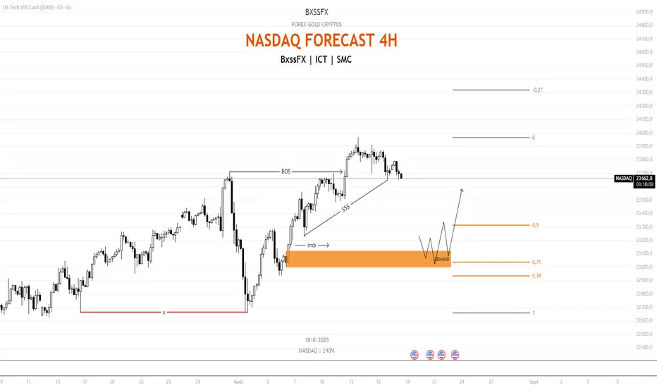 Après une impulsion haussière marquée, le prix corrige en direction de la zone de demand H4 identifiée autour des 23 000 – 23 200.