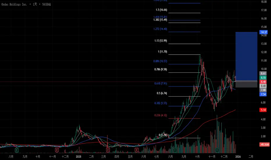 前陣子較熱門標的,因這幾週的回調,波動相較之前小一些,最近出量重新站回所有均線,並在週五時回踩,先將SL放在出量的K棒低點,TP的部分可以分為2個,1.前方波段高點,2.斐波1.272~1.382的TP區間,可以視情況出場一定比例的倉位