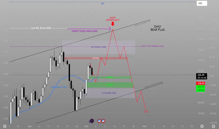 We find ourselves slowly rejecting off of the 50% area of our weekly PA channel and off of the Daily 21EMA. We retrace down to and tap into the Daily FVG located just below price and we get a bounce to the 0.786 level of the ATH to shake retail once more before we change momentum and see a massive reversal as we clear the Supply Zone created by the ATH to sweep the final Buy Side Liquidity pocket and implement a false breakout of our PA channel for a short opportunity.