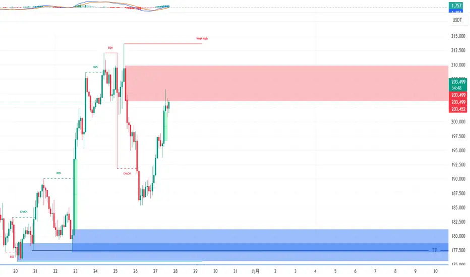 前高213位置出現流動性獵取,空頭趨勢,下跌中繼回踩6小時與2小時OB訂單塊+斐波回測0.618與0.7025範圍內,第一止盈抓下方1小時與30分的訂單塊重疊位置,最終止盈用斐波擴展抓TP2 180(剛好是1小時與2小時推進塊回踩位置)