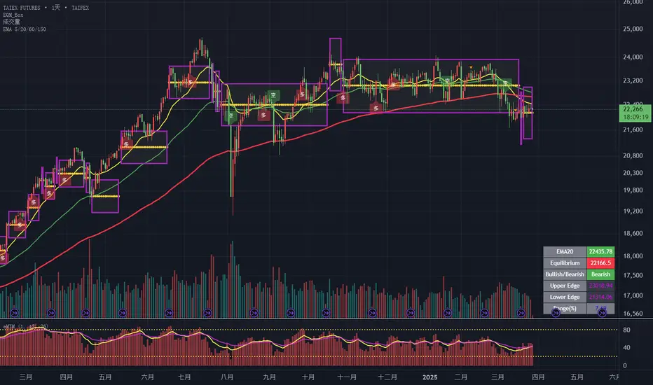 從圖上可以看到最近價位跌破了長期盤整區間(約從 23,000 到 24,000 點),同時也跌破了紅色的 EMA150 線,這是一個蠻明顯的轉弱訊號。目前反彈也只碰到 EMA20 附近(大約 22,435),就被壓下來,代表這裡壓力很重。