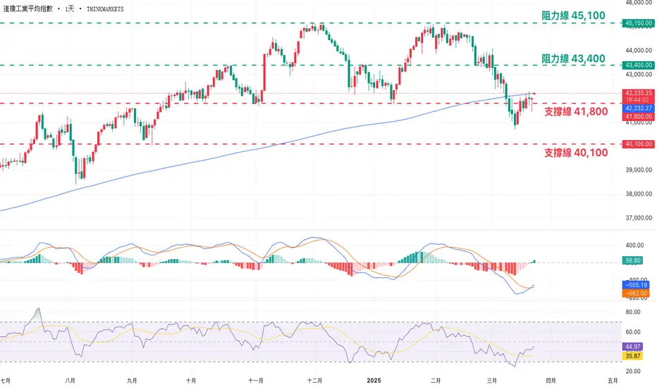 技術指標方面,MACD出現黃金交叉,RSI自超賣區域反彈,顯示短期多頭動能回升,US30有望延續反彈走勢。