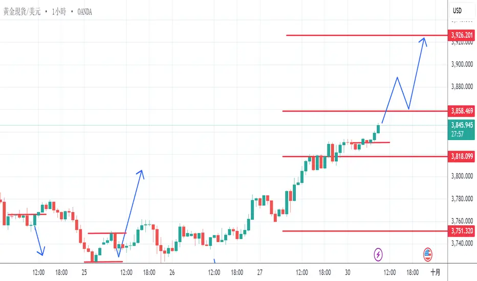 黃金上漲空間有機會看至3855價位,目標價位3885、3910,可以關注3818-3830價位是否突破區間,下跌空間趨勢看至3760價位。