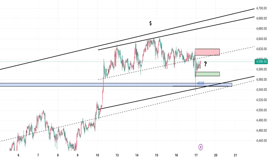 直至星期5️⃣價格突破向下爆,下降到上升通道一比一/ 4️⃣5️⃣5️⃣0️⃣左右停。