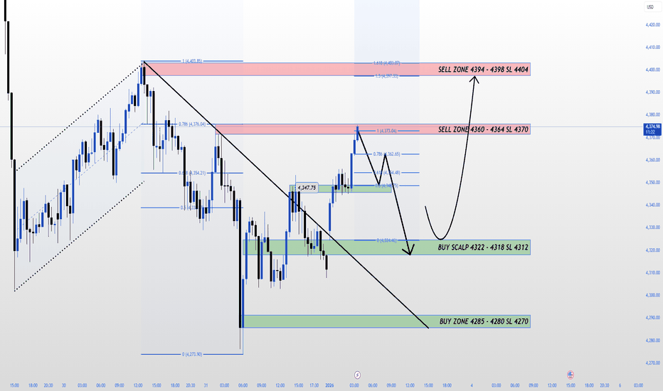 XAUUSD H1 — 下周流動性遊戲:先掃再趨勢?在強勁的星期五拋售之後(典型的年初流動),黃金現在正回到平衡/需求區域。年初的第一周通常會呈現一種模式:推進 → 掃蕩 → 真正的移動。因此,FranCi$ 專注於區域反應 + 確認,而不是急著追逐中間位置。
