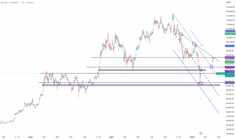 BTCUSD 關鍵決策區:$71,393 阻力重測,是 V 反延續還是死貓跳?$60,000 絕地反擊比特幣在經歷了從 $126k 到 $60k 的深度回調後,於 $60,000 關口(圖中下方黑色支撐帶)獲得了戰略性支撐。