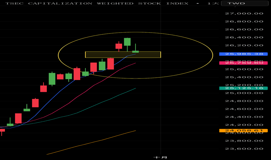 9/29-本周收盤25,580.32點,9/24日最高觸及26394.73 點。預季線乖離來到9.48%,上週提醒進入警戒須謹慎面對 8%–12% 的乖離區間,該區為回調風險帶,波動加劇,切勿盲目追高,急漲急跌反向操作,買黑不買紅.9/26周五回測近期較大跌幅(443.53點)-1.70%,修正乖離並回補本波9/23第三缺口(逃逸缺口).短線進入修正但多頭趨勢未變,預計10月將回測季線.注意10月大盤收黑K月線1000~1500點的波段回測.