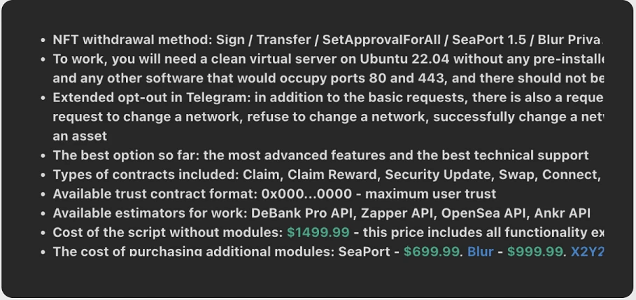 Further investigation revealed that the developer of MS Drainer employed an unusual marketing strategy. While most wallet drainers charge a percentage of scammers’ profits, this one was sold on forums for a flat fee of $1,499.99. If a scammer wanted more features, the developer provided them with additional “modules” for $699.99, $999.99 or similar sums.