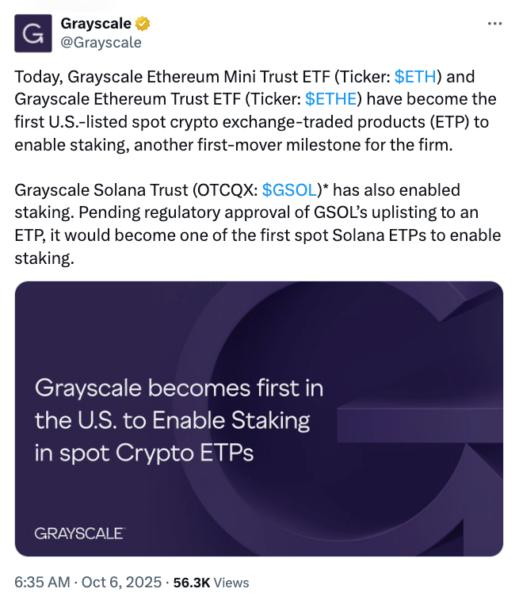 Despite the anticipated slowdown, Grayscale Investments — the second-largest US crypto ETF provider, after BlackRock — debuted the first US-listed spot crypto ETPs, enabling staking, on Monday.