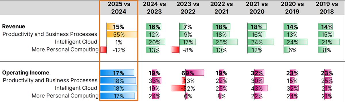 Microsoft’s earnings release on the 30th of July this year marked the end of its full Fiscal Year (FY) 2025 ended in June. For the recently concluded FY, Productivity and Business Processes (PBC) – which has its business products tie into the company’s Azure and cloud services – showed an explosive 55% growth relative to FY 2024, leading to a 15% increase in overall revenue, despite Personal Computing (which centres around consumer spending) dropped by 12%.