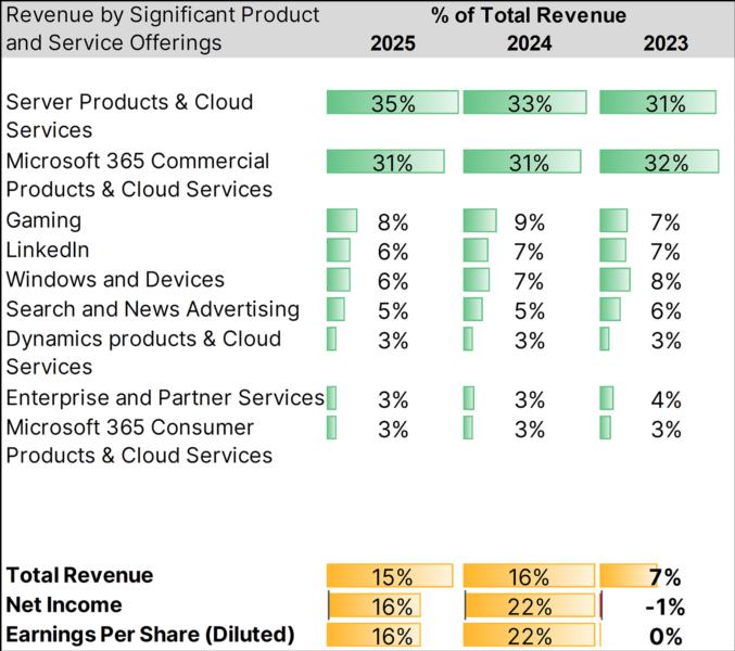 Nearly every other product and service – ranging from Gaming to LinkedIn – have seen a relative drop in comparative revenue share over the previous year. Overall, revenue and earnings per share (EPS) growth march in lockstep, making Microsoft a stable performance provider for the portfolio.