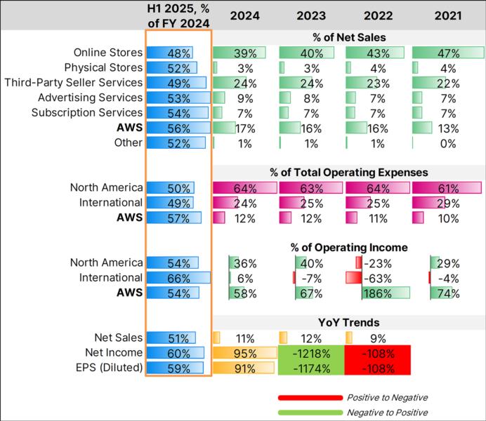 The pass-through effects of AWS’ outsized contribution on bottom-line trends are telling: if current trends were to continue, Amazon will close out the year with only a 2% growth in net sales but a solid 18-20% growth in both net income and diluted EPS. Amazon CEO Andy Jassy – who led AWS prior to becoming the CEO – seems to recognize AWS’ place within the company: over H1, Amazon incurred $55.4 billion in capital expenditure (capex), which implies a net expenditure of $118 billion1 for FY 2025 versus its previous forecast of $100 billion. In FY 2024, Amazon’s capex hit $83 billion and primarily went toward building out infrastructure to support artificial intelligence demand.In Conclusion