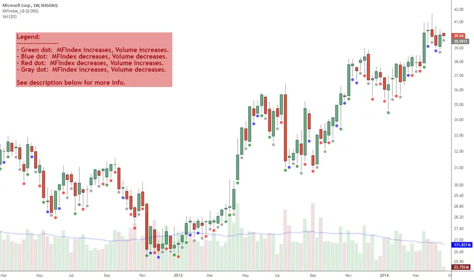 MFIndex increases and the volume increases. This means that the amount of participants entering the market increases, therefore the volume increases and the fresh incoming players align their positions in the direction of candlestick growth.