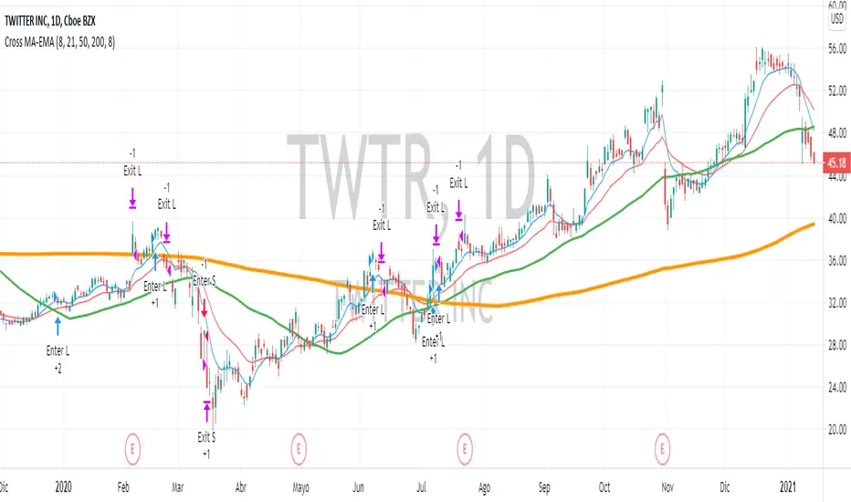 Implementation of the strategy of moving averages crossings combining two fast [EMA] and two slow [MA] that are used to confirm the entry.