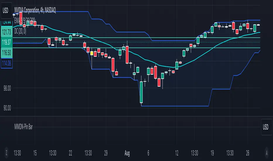 This Pine Script code is designed to highlight Pin Bars on a TradingView chart by changing their color to yellow. A Pin Bar is a type of candlestick pattern that typically indicates a potential reversal in the market. The script uses specific conditions to identify bullish and bearish Pin Bars based on the size of the candlestick body and the length of the shadows (wicks).
