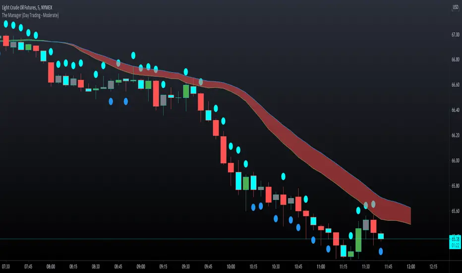 Remember when day trading or swing trading, there is usually a data or news catalyst that reverses the direction of an instrument and potentially a trade that you are in. "The Manager" soon spots those with either accumulation or distribution candles combining with higher than average volume. And usually with a distinct candle stick formation rejecting highs or lows. The ability for you to visually see this on your chart with our indicator gives you chance to maximise your profits by understanding the behaviour represented by the coloured candles and the dots above or below the candles. The BIAS cloud allows for a more conservative approach to this as discussed above