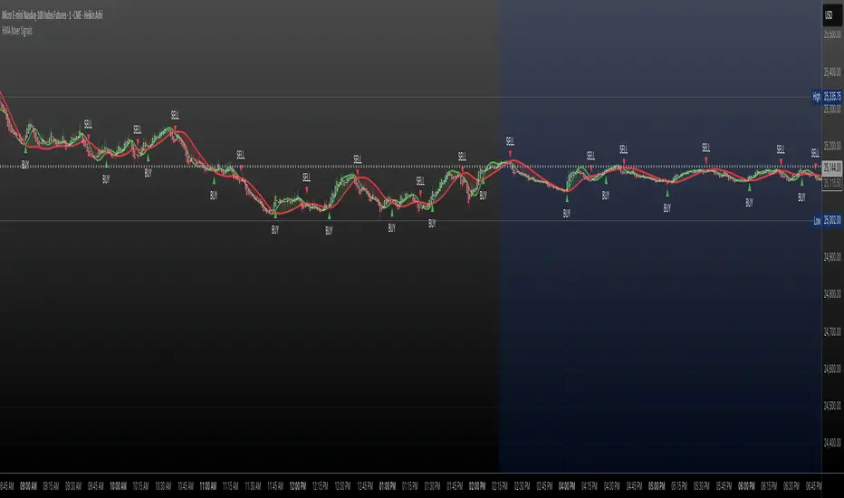 The script includes visual tools such as a color-shifting ribbon between HMAs, optional background shading to show market regime, and lightweight buy/sell labels for quick signal recognition. Alerts are built in so you can automate notifications when crossover conditions occur.