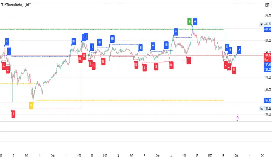 - Unlike most indicators that rely on a predefined number of candles (lookback period) to determine highs or lows, this script dynamically updates levels based solely on price action.