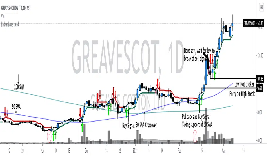 A very simple but effective supertrend startegy which help u to get good RR. It is combination of 3 supertrend values with sma crossover. Enrty at pullback after sma crossover , exit only if sell signal low is broken.